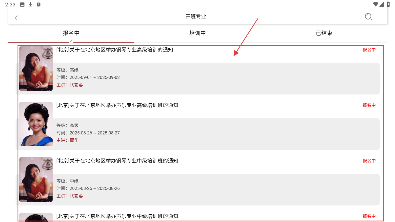 2、在开班专业页,选【报名中】的培训(如钢琴高级),查看详情。