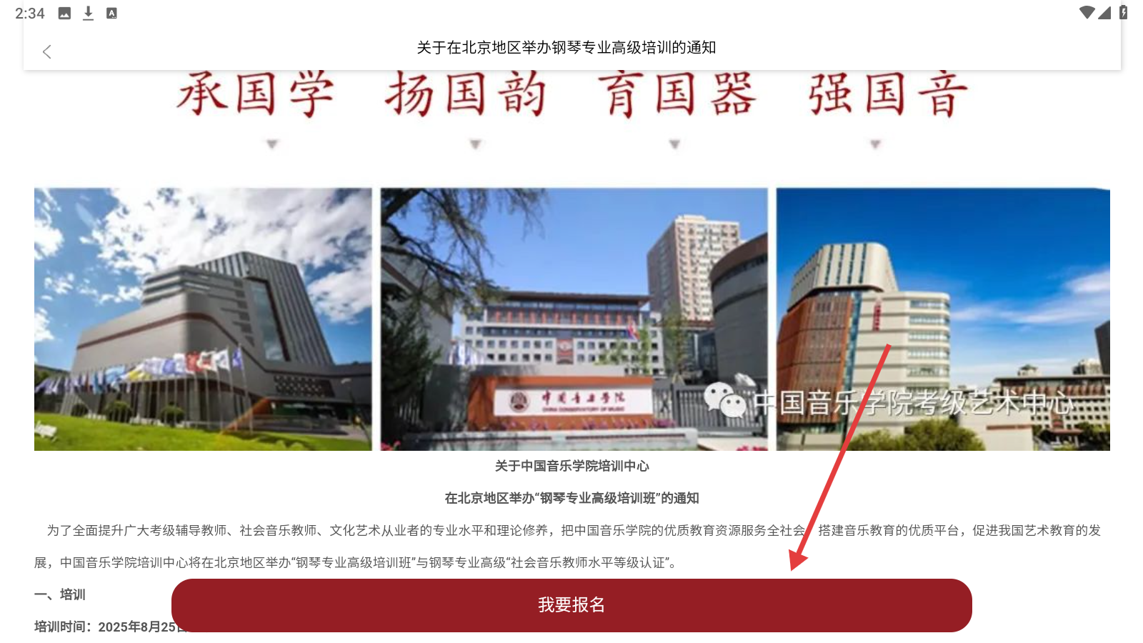 3、进入培训通知页,阅读内容后,点【我要报名】,参与钢琴高级培训。