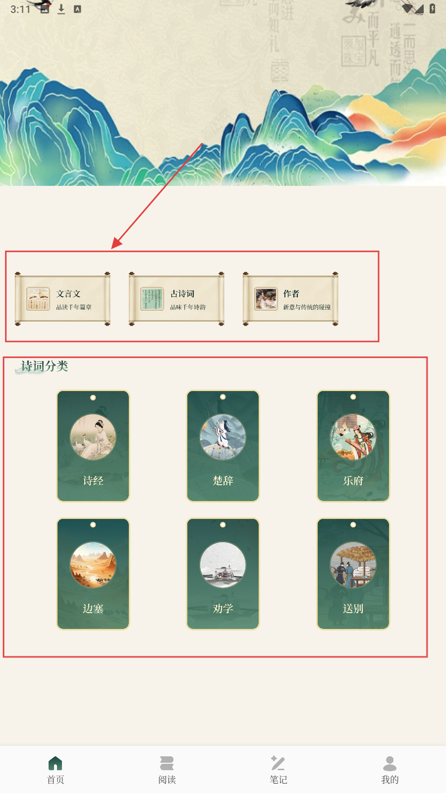 1、进入首页,选【文言文/古诗词/作者】或诗词分类(如诗经),开启文学学习。