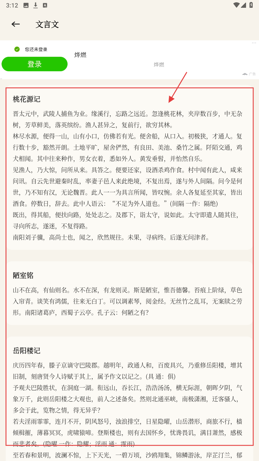 2、在【文言文】页,选文章(如《桃花源记》),查看原文内容,开始阅读学习。