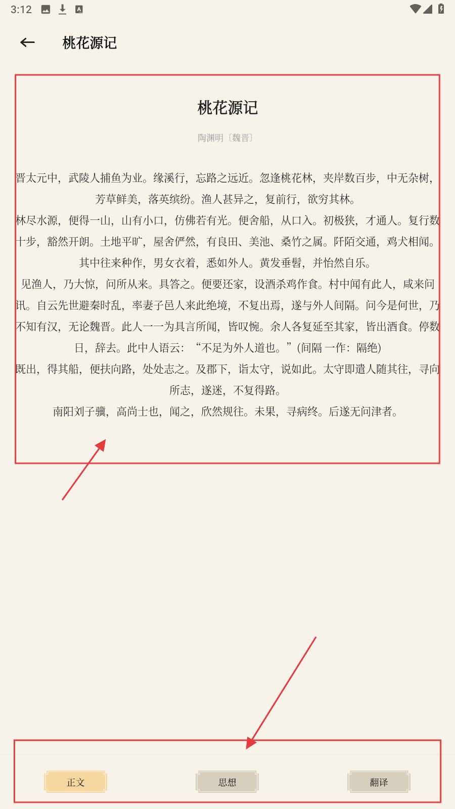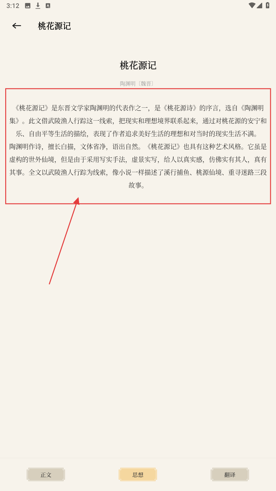 3、进入《桃花源记》详情,可切换【正文/思想/翻译】,深入理解文章内容。