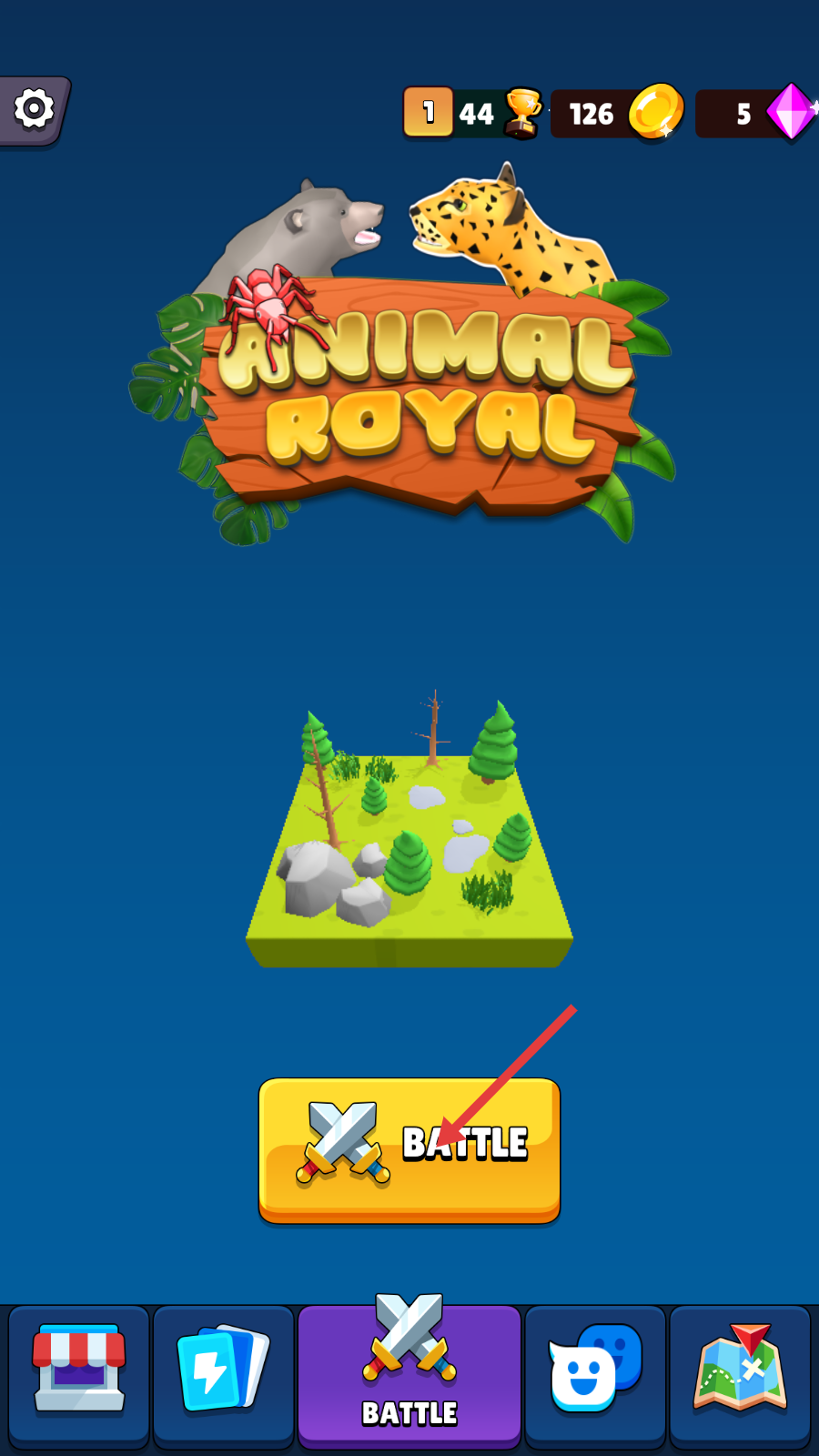 1、进入【ANIMAL-ROYAL】,点击黄色【BATTLE】按钮,消耗体力开启动物对战,抢占资源区。