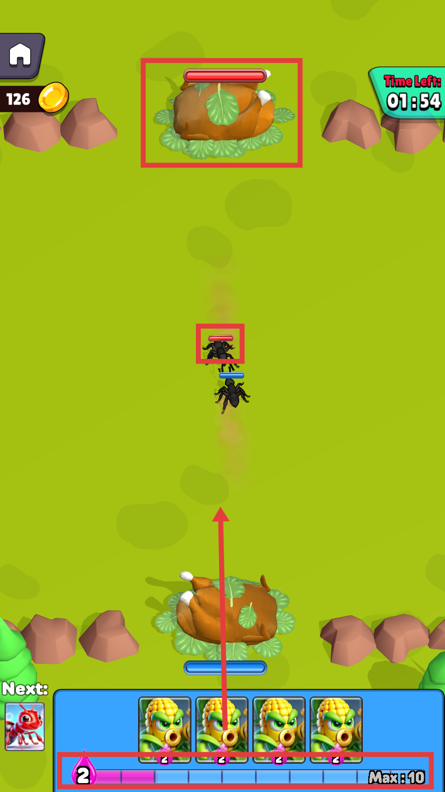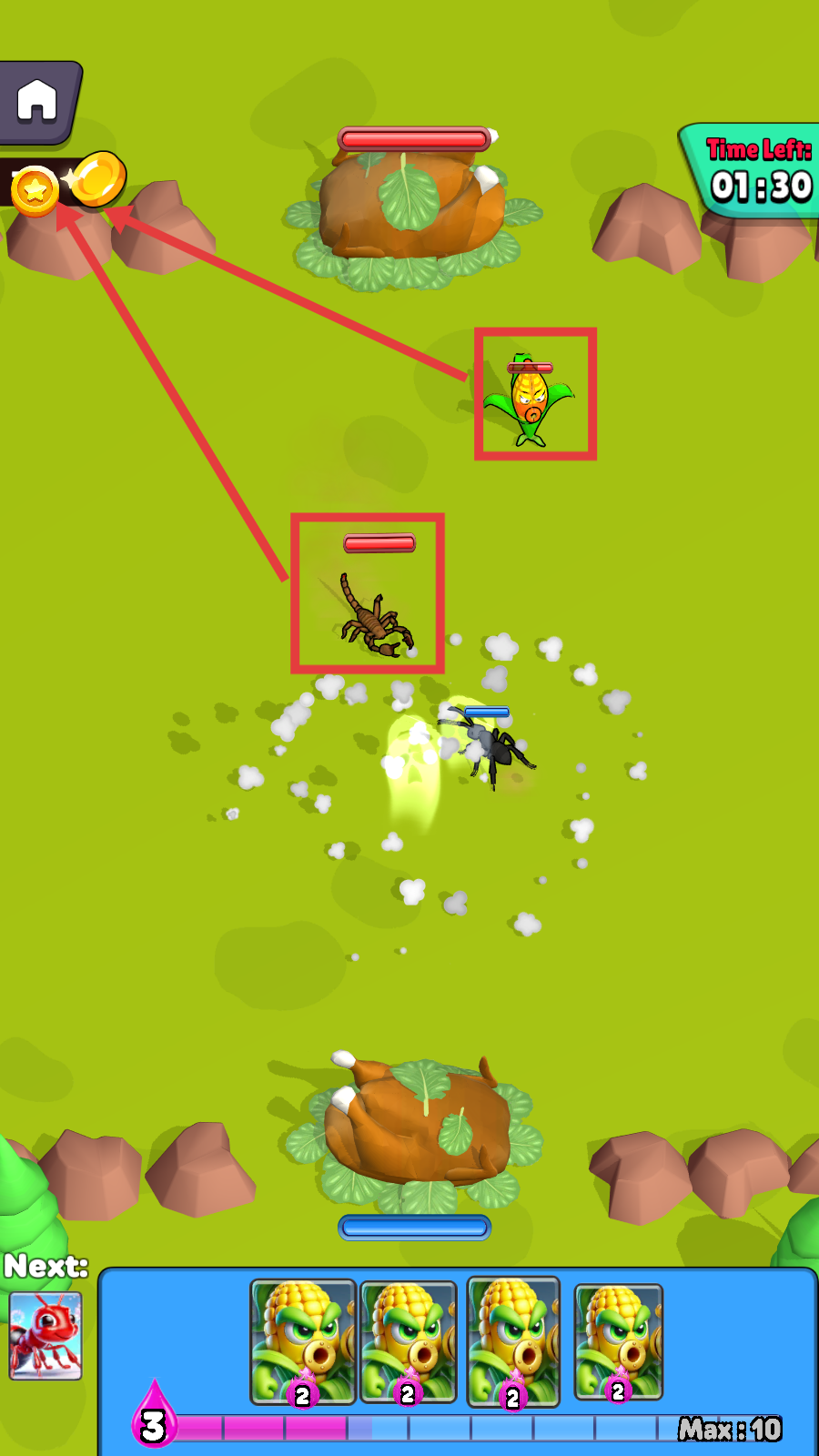 3、部署玉米射手,攻击【蝎子】等敌人,消灭目标后拾取【金币】,积累资源强化阵容。