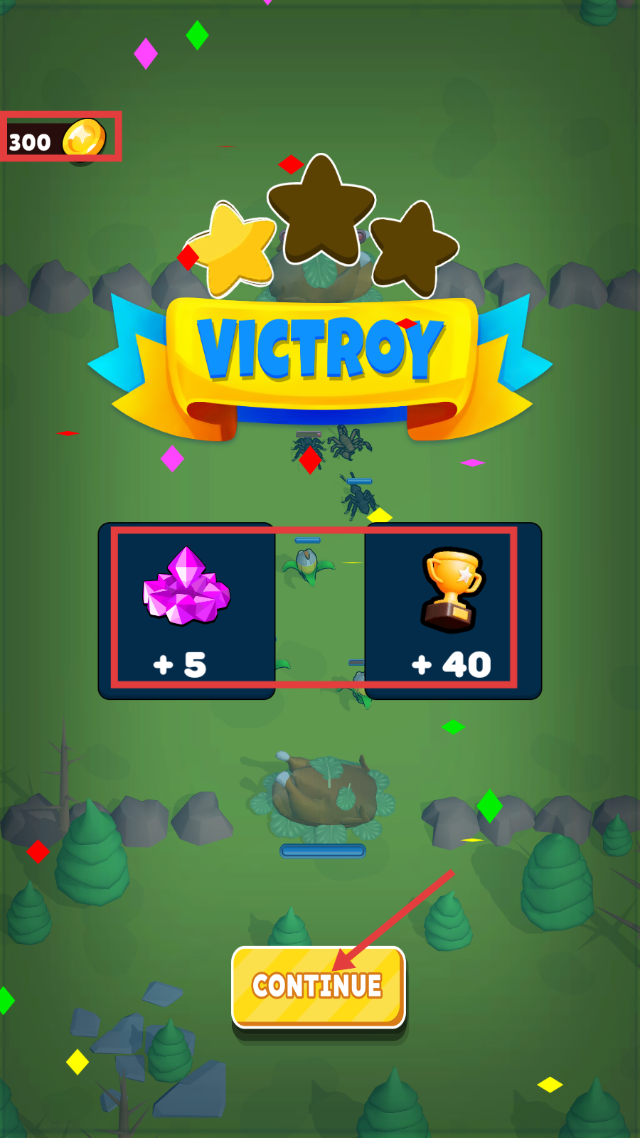 4、胜利后获取【300-金币】【+5-水晶】【+40-奖杯】,点击【CONTINUE】,解锁更多战斗。