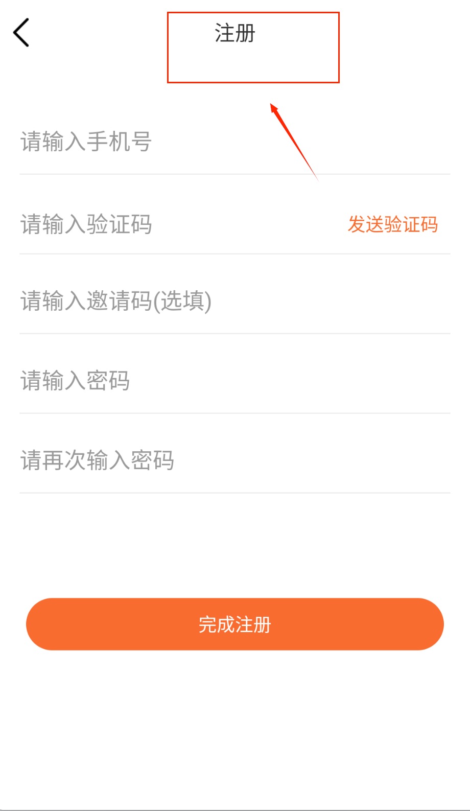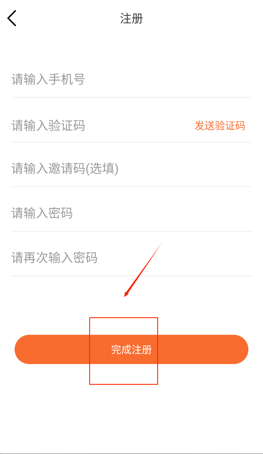 2、在注册页面依次输入手机号、验证码和密码,邀请码选填可不写,点击橙色发送验证码按钮获取短信验证码。