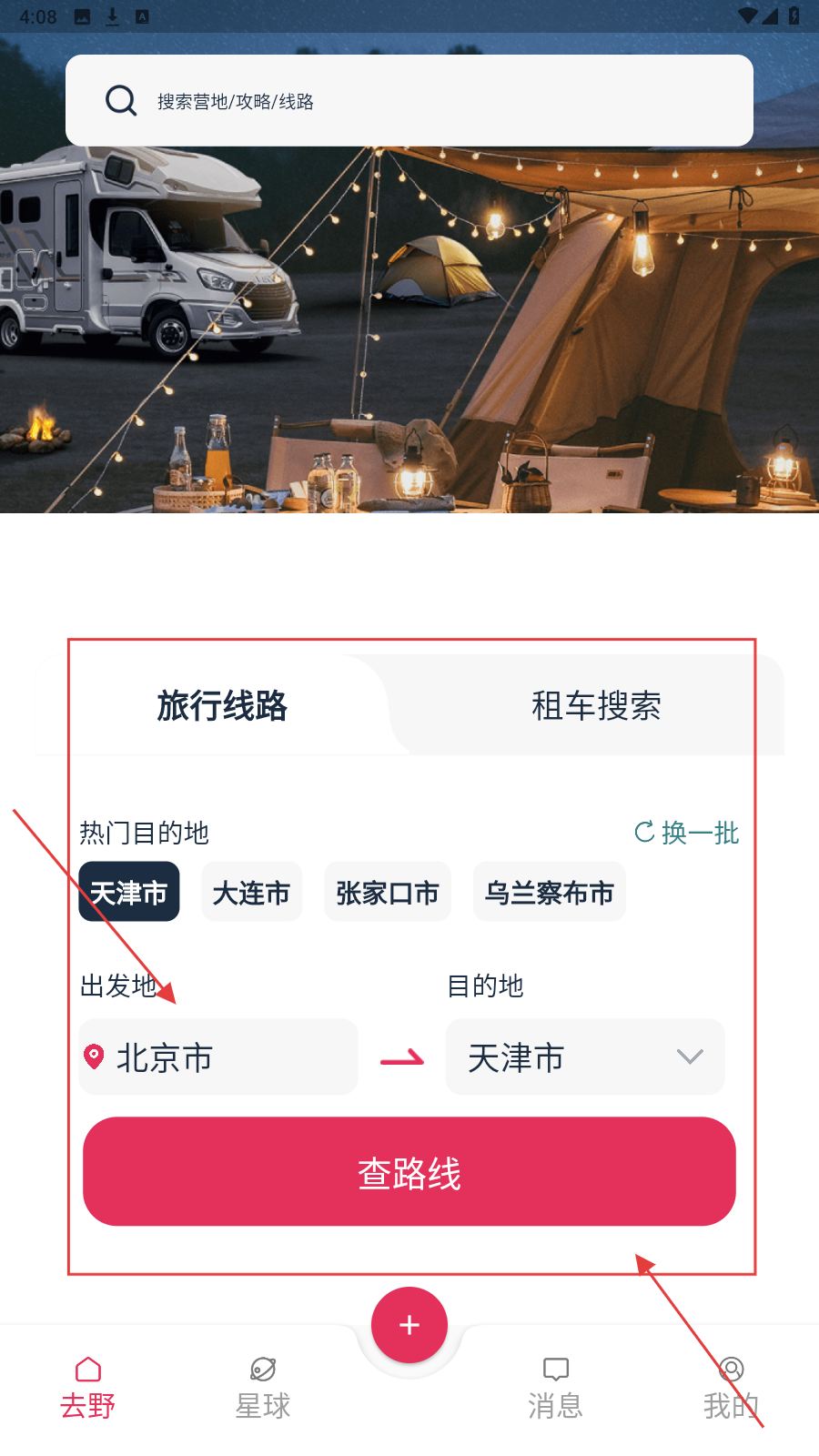 1、在【去野】页,选出发地-目的地(如北京-天津),点【查路线】规划行程。