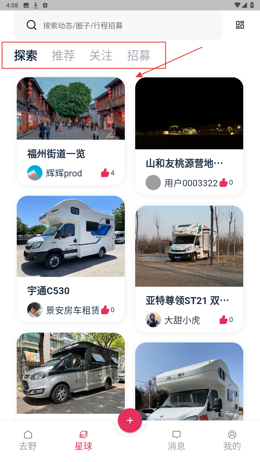 3、切换【星球】页,在【探索】栏,浏览房车、营地等动态,发现旅行灵感。
