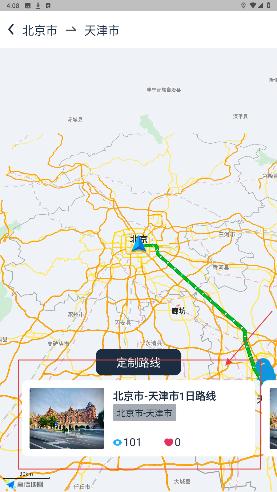 2、查路线后,可定制路线,选【北京市-天津市1日路线】,查看行程详情。