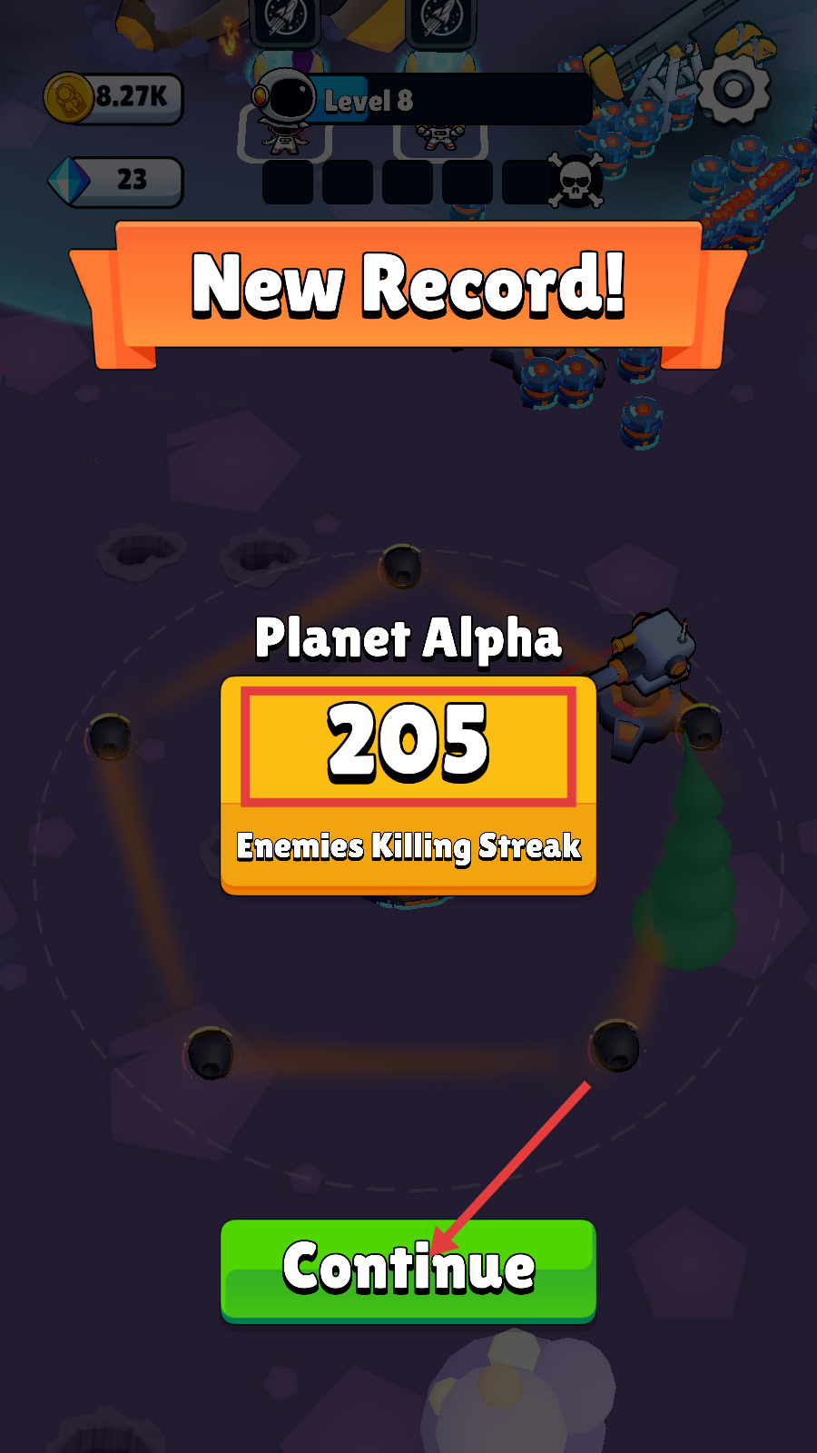 4、通关后点击【Continue】,保留【205-Enemies-Killing-Streak】记录,推进游戏进程。