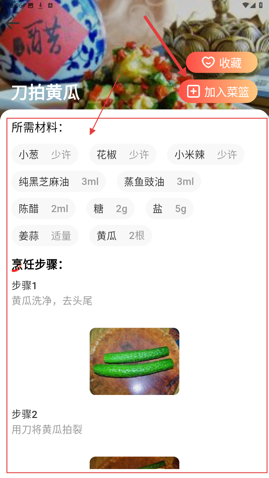 3、如查看【刀拍黄瓜】菜谱,了解所需材料等信息,跟随烹饪步骤进行制作即可。如若缺少食材可以点击【加入菜篮】。