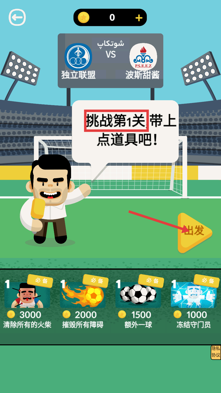 1、选择【挑战第1关】,按需搭配下方道具(如“额外一球”),点击【出发】开启赛事。