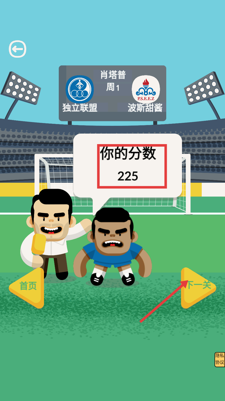 4、结算时查看【你的分数-225】,点击【下一关】,持续挑战提升竞技表现。