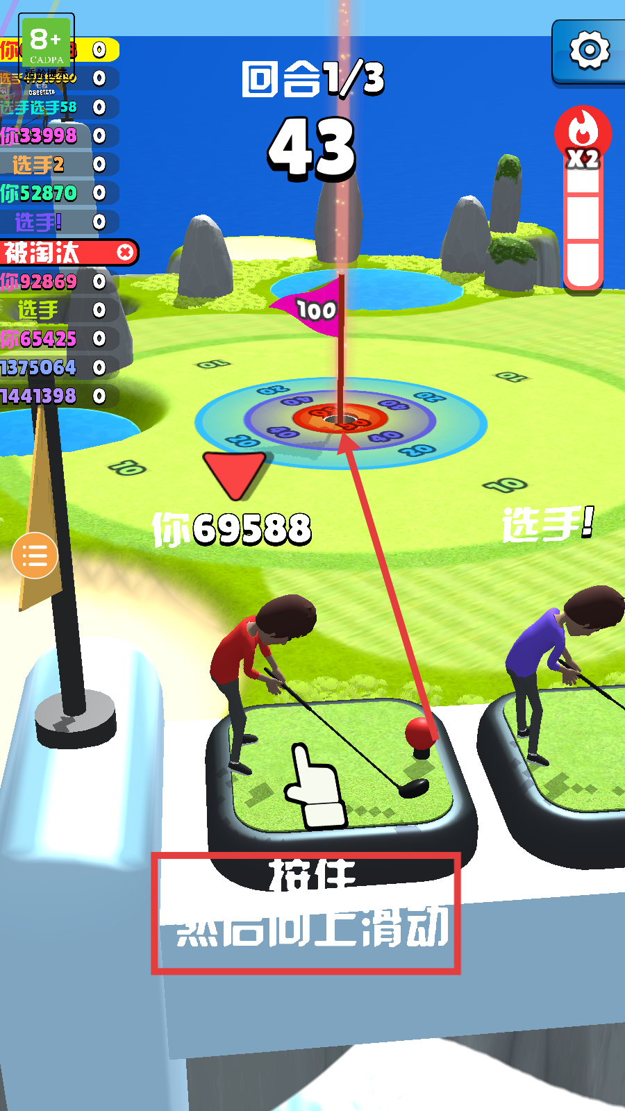 2、回合中遵循【按住然后向上滑动】提示,把控击球力度,瞄准靶心(100分区优先)。