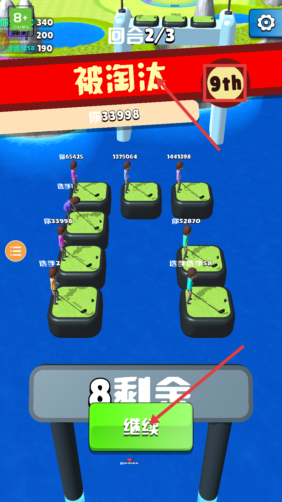 4、若回合后显示【被淘汰-9th】,点击【继续】重启比赛,优化击球策略冲榜。
