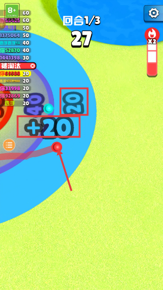 3、击球后争取落位【20】等高分区域,触发【+20】积分,提升排名竞争力。