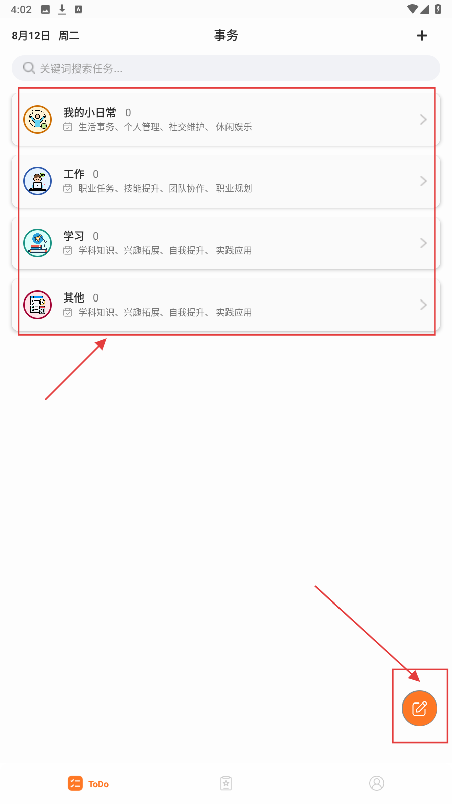 1、进入事务页,选【我的小日常-工作-学习-其他】分类,点右下角橙色按钮可添加任务。