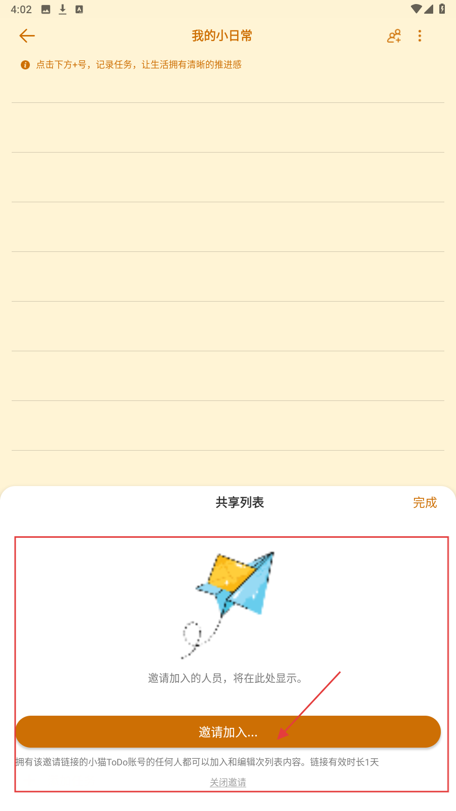 3、点【我的小日常】右上角图标,在弹出的【共享列表】里,点【邀请加入...】可分享任务列表。