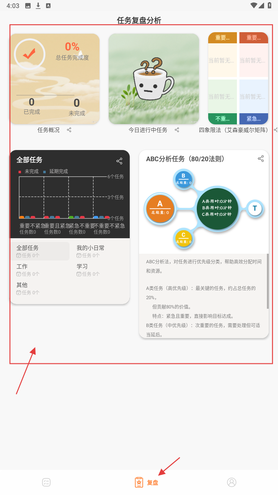 4、完成任务后,点底部【复盘】,查看【任务复盘分析】,了解任务完成度和分类数据。