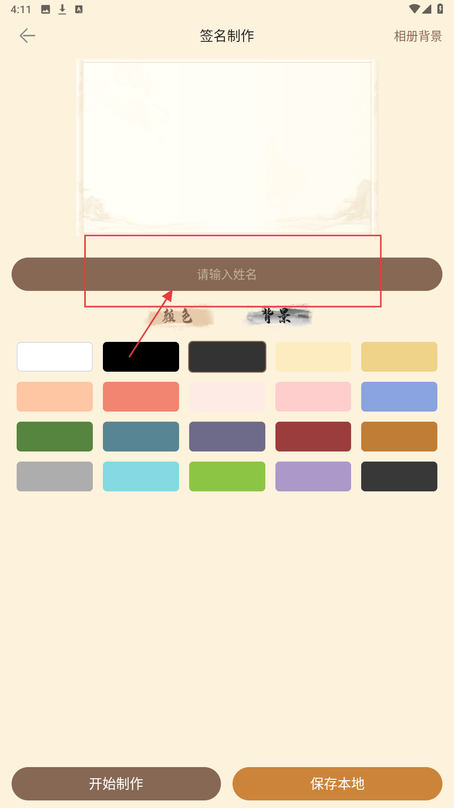 2、点【艺术签名】,在【签名制作】页输入姓名,选颜色和背景。