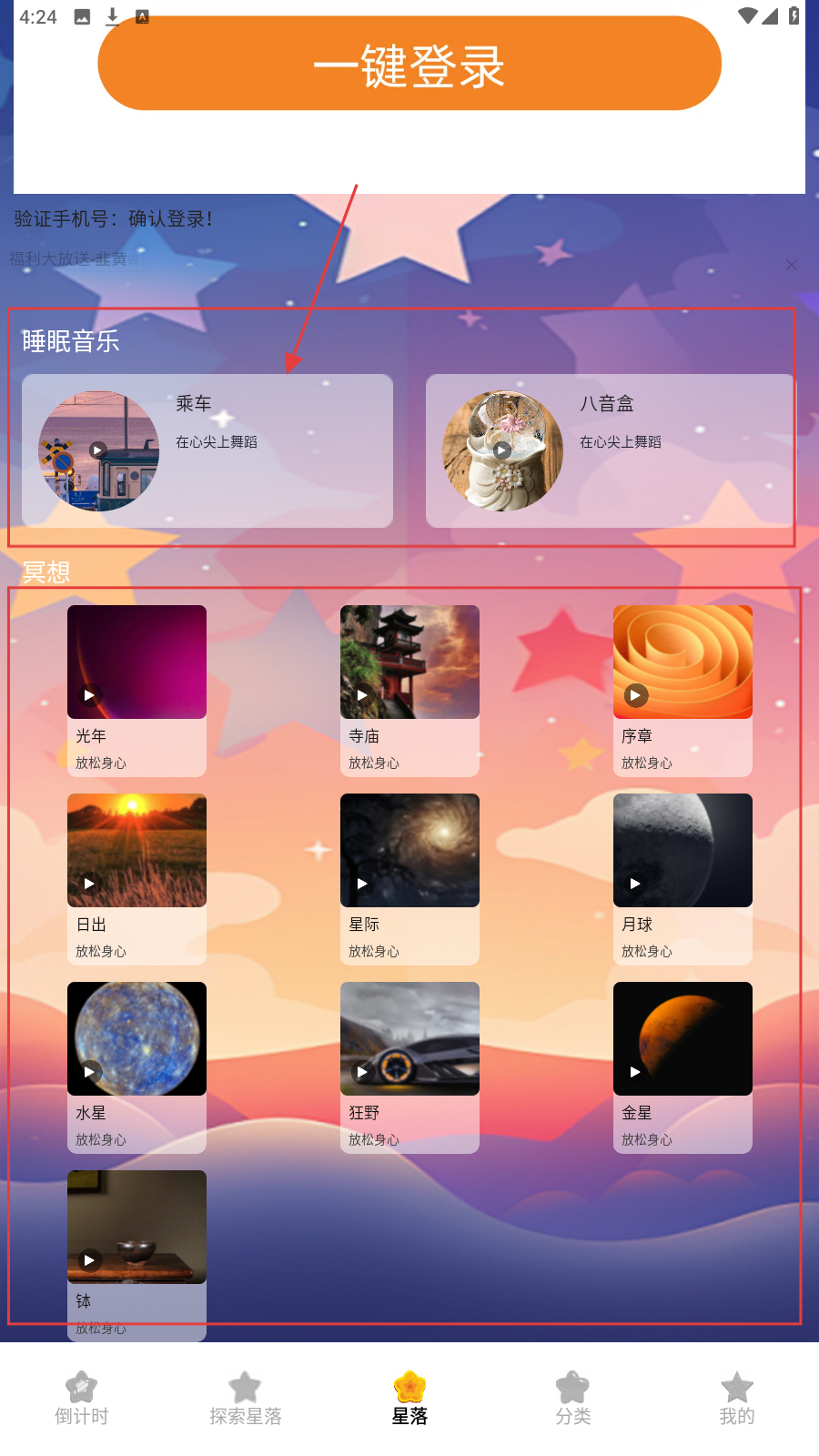 3、切换到【星落】页,选【睡眠音乐-冥想】分类内容,点【乘车-八音盒】等音频播放。