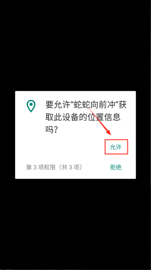 1、允许权限:看到“要允许‘蛇蛇向前冲’获取此设备的位置信息吗?”弹窗后,点击“允许”按钮完成授权。