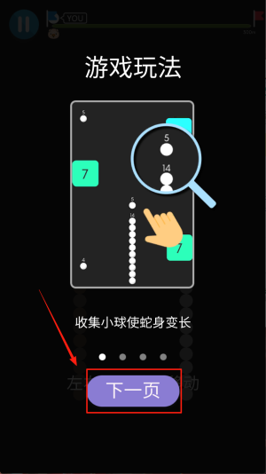 3、查看规则:阅读“游戏玩法——收集小球使蛇身变长”后,点击“下一页”按钮正式进入关卡。