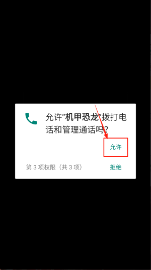 2、授权电话:当弹出“允许机甲恐龙拨打电话和管理通话吗?”时,点击“允许”按钮继续。