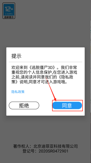 1、同意隐私:在适龄提示页面,点击“隐私政策”后选择“同意”,确认进入游戏。
