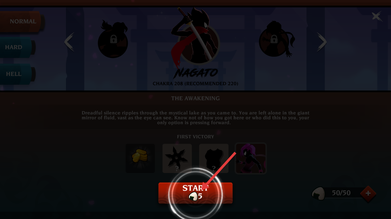 1、挑战前留意【CHAKRA-208】与推荐值差距,储备道具后点击【START】开启关卡,避免硬刚。