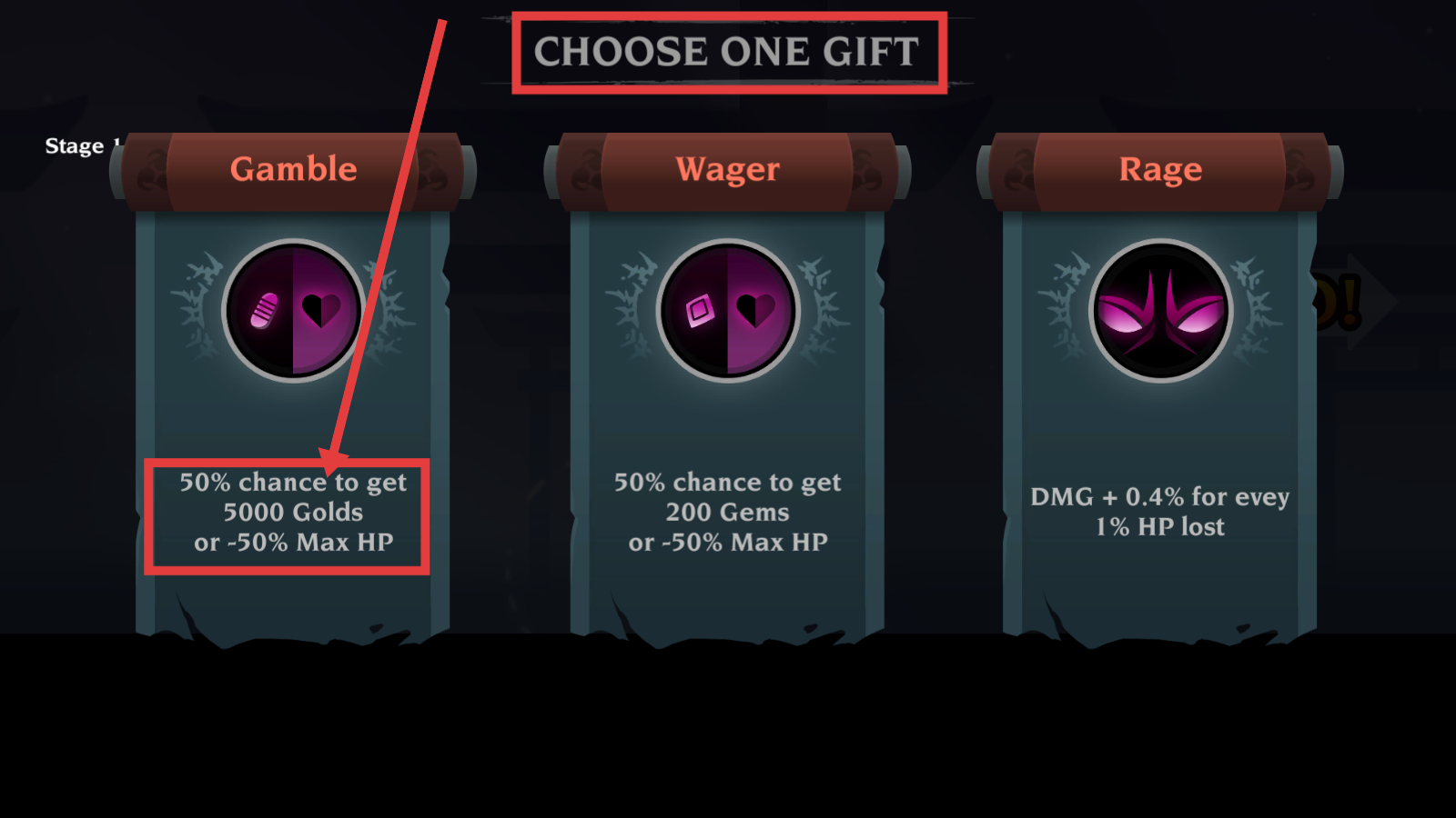 3、选礼物时,若血量健康可尝试【Gamble】,50%概率获【5000-Golds】,资源紧缺时值得一搏,风险需权衡。