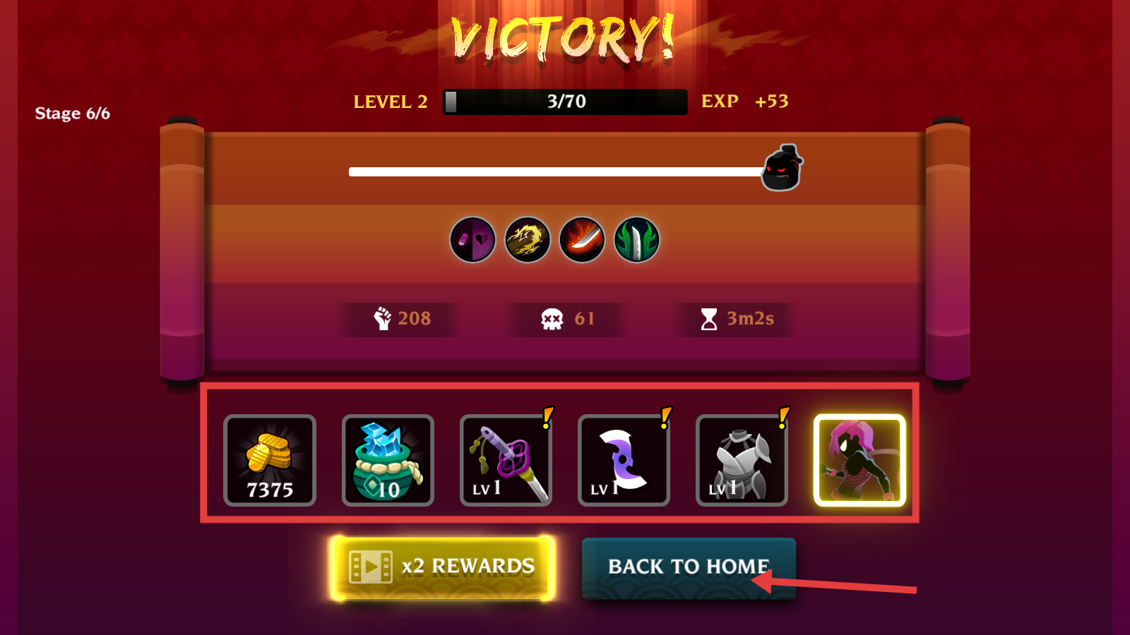 4、胜利后优先领取【7375-金币】等奖励,若时间充裕可看广告翻倍,再点【BACK-TO-HOME】整理装备。
