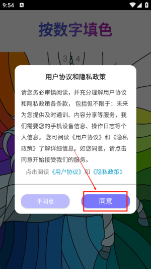 1、同意协议:点击“同意”按钮,接受用户协议和隐私政策,开始使用应用。