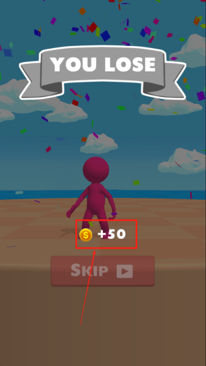 4、游戏结束:如果失败,点击“SKIP”按钮可以重新开始,同时获得额外的金币奖励。