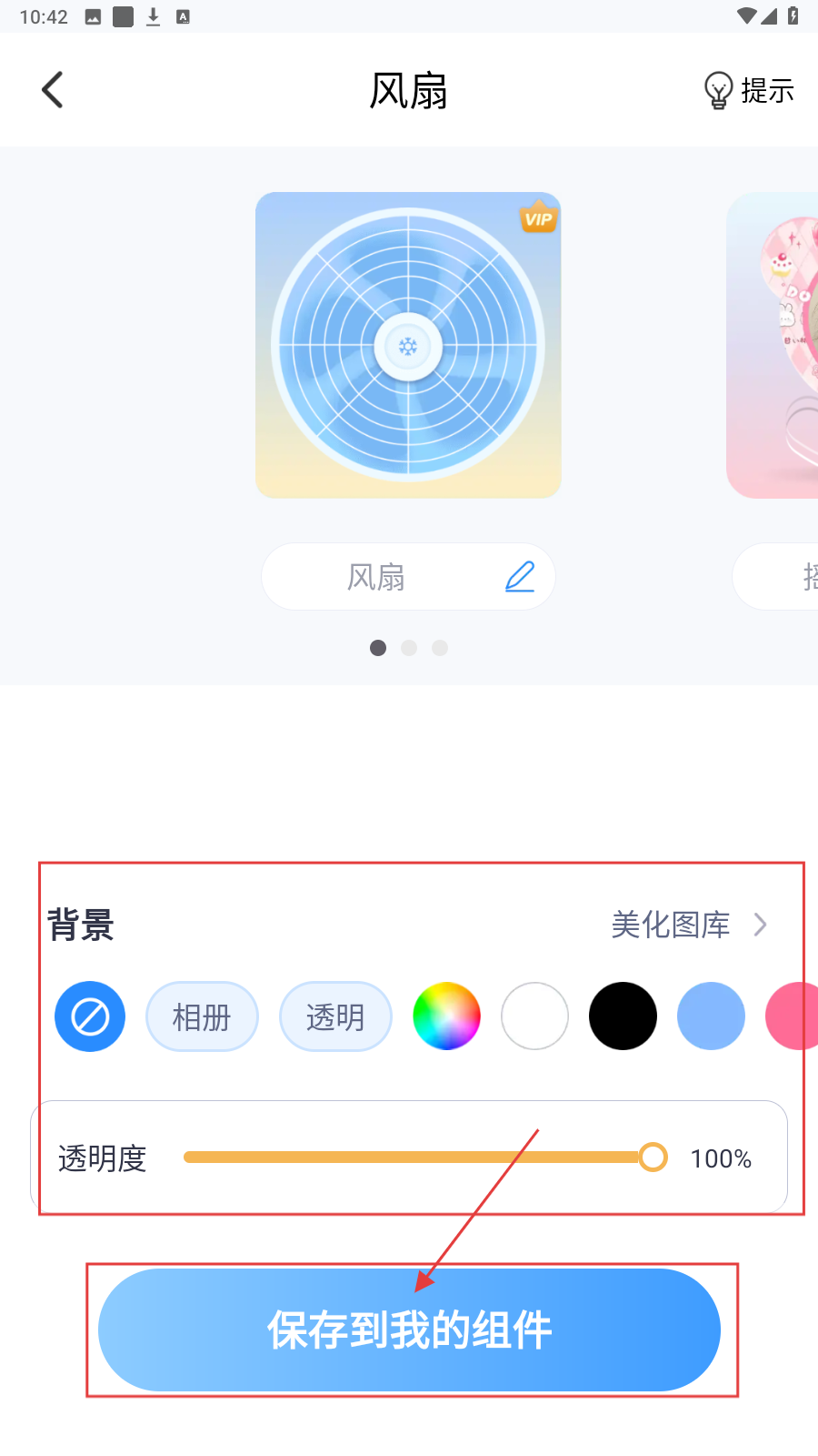 2、进入小组件详情页面,可以进行设置小组件颜色、透明度等,设置完成后点击【保存到我的组件】。