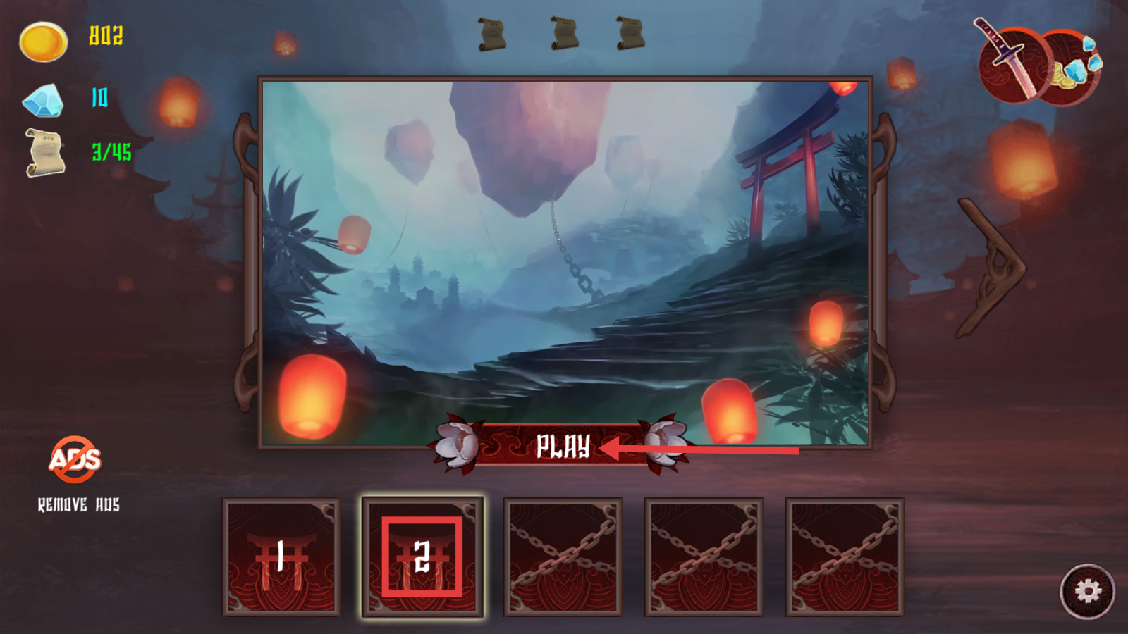1、主界面选【关卡2】,点击【PLAY】,初始资源(802金币、10钻石、3卷轴)开局,快速进入战斗。