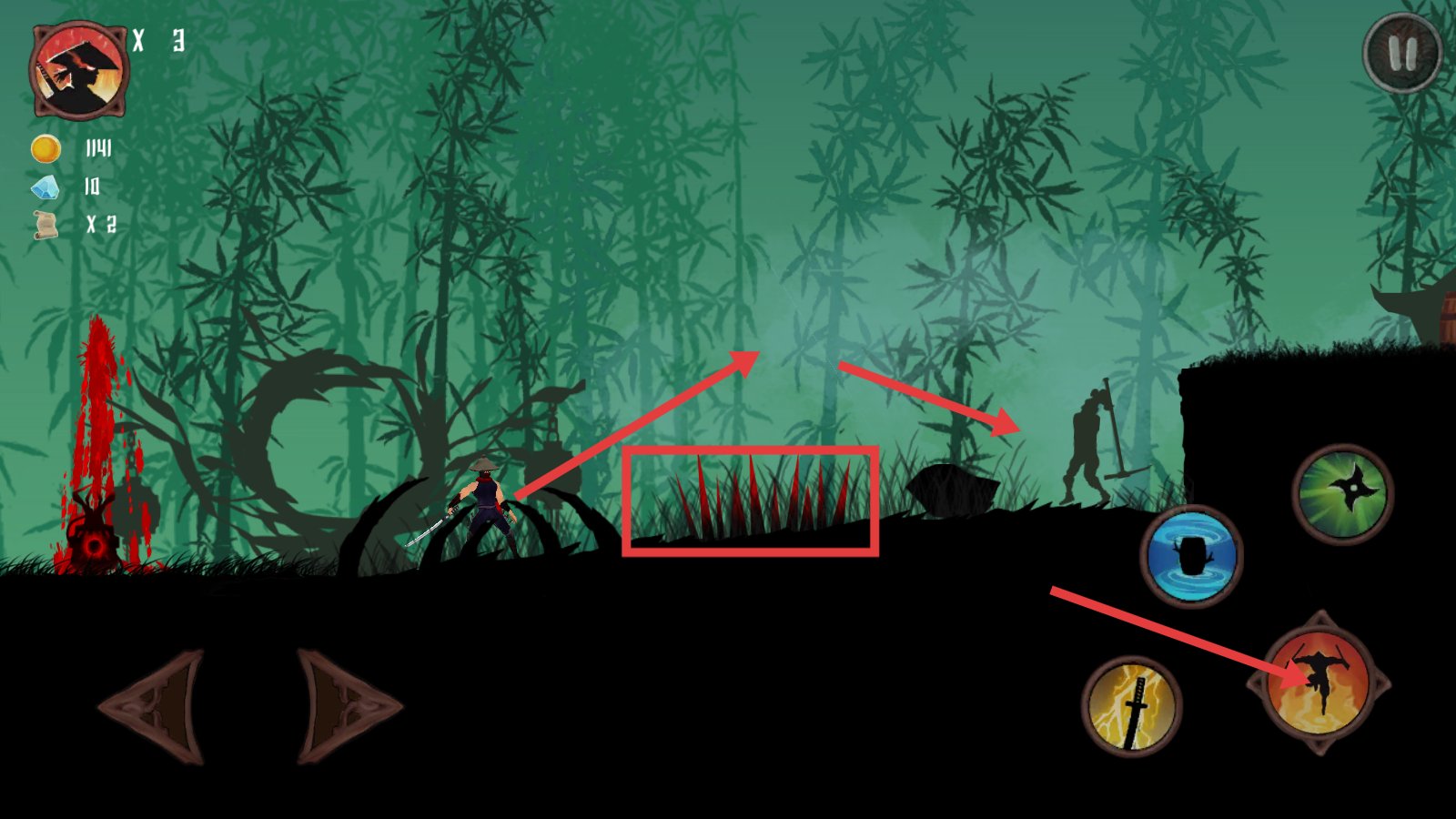 3、遇【尖刺陷阱】绕行,对远程敌人用【突进技能】秒杀,减少血量消耗,稳步推进关卡。