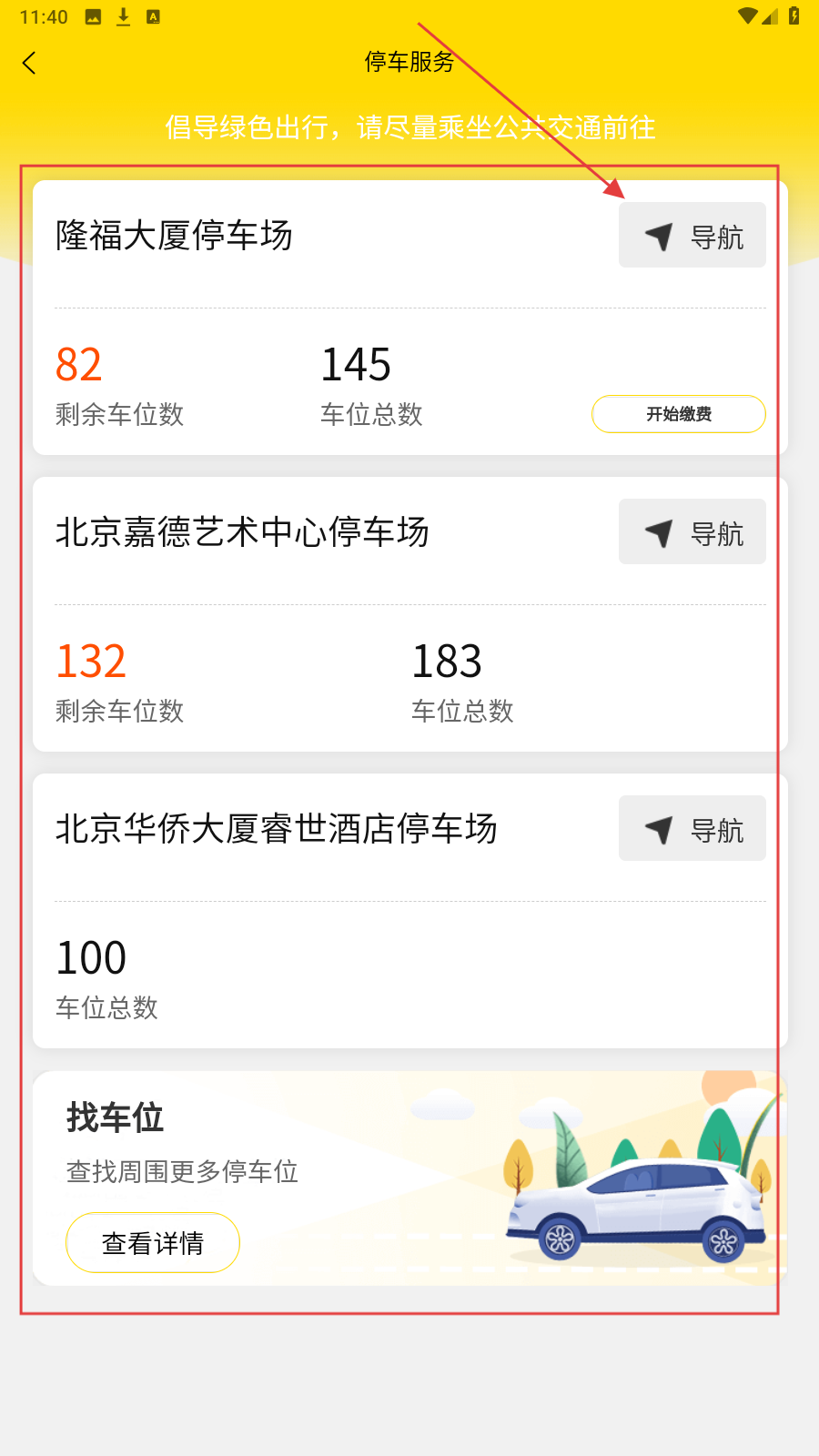 2、在停车服务页,选目标停车场,点【导航】,获取前往路线。