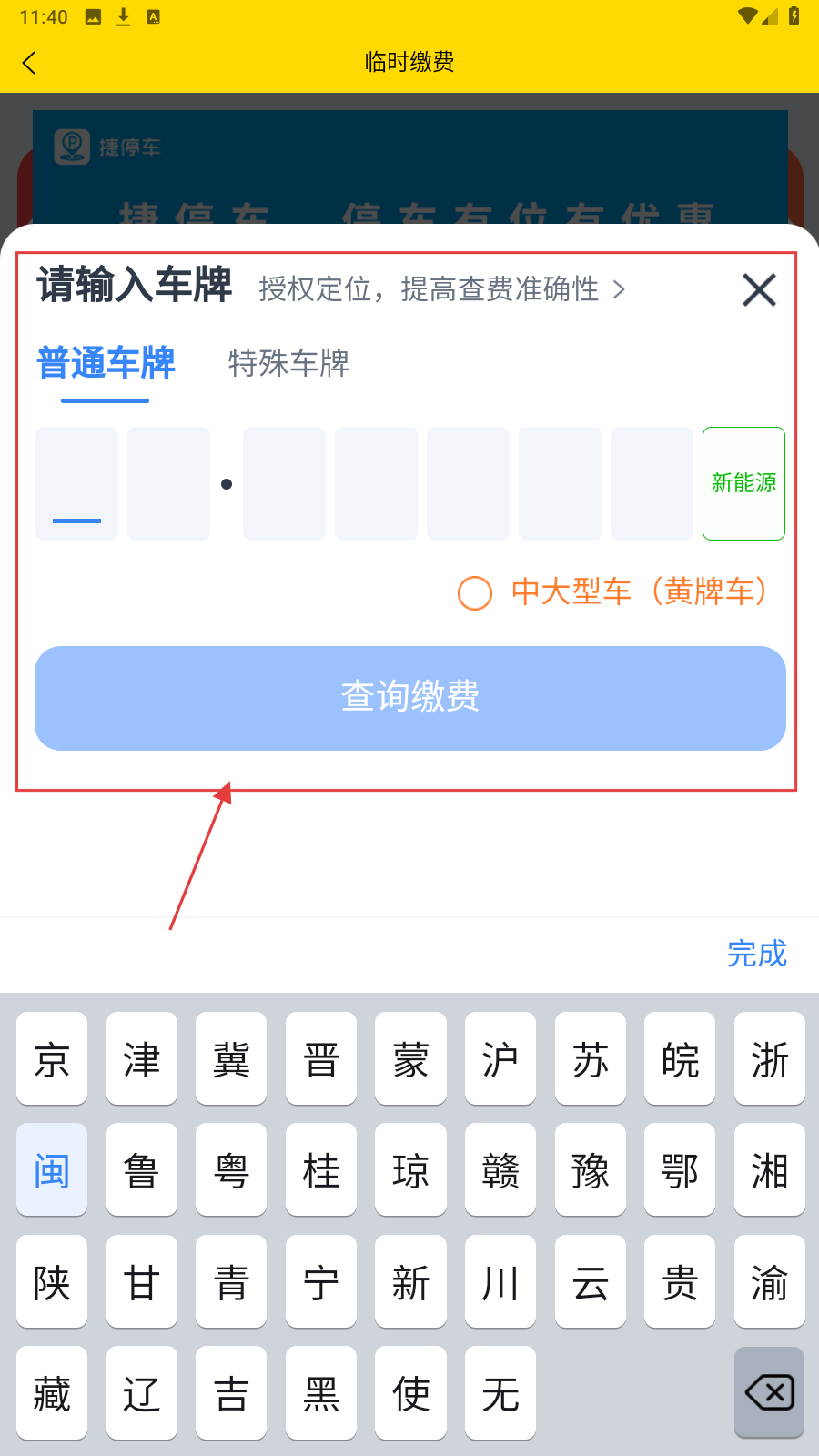 4、离场前,在【临时缴费】页输车牌,点【查询缴费】完成支付。