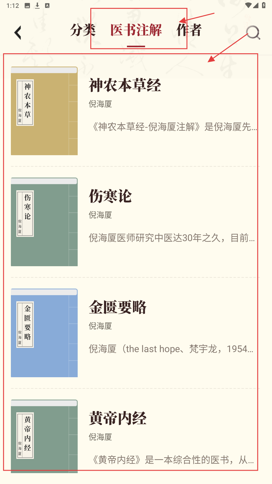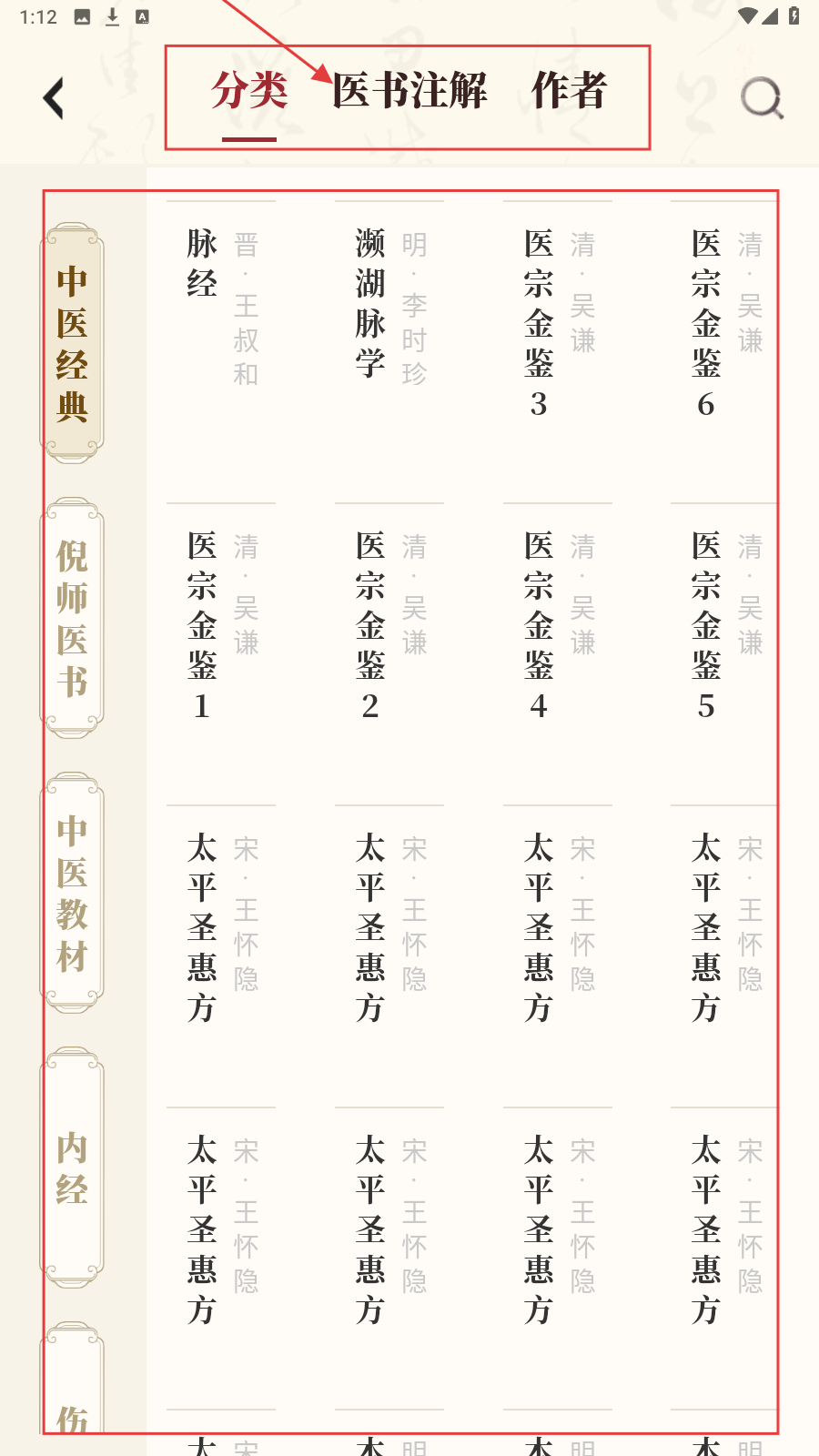 2、在【分类】栏,浏览中医经典等分类,按需筛选心仪医书资源。
