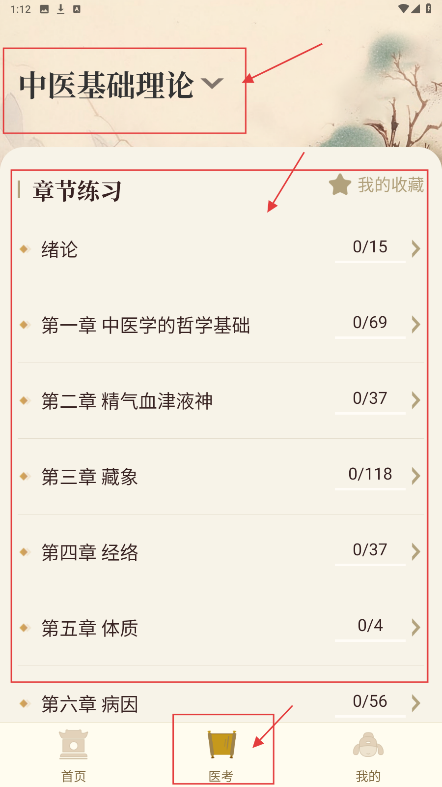 4、点【医考】,选【中医基础理论】,通过章节练习巩固知识。