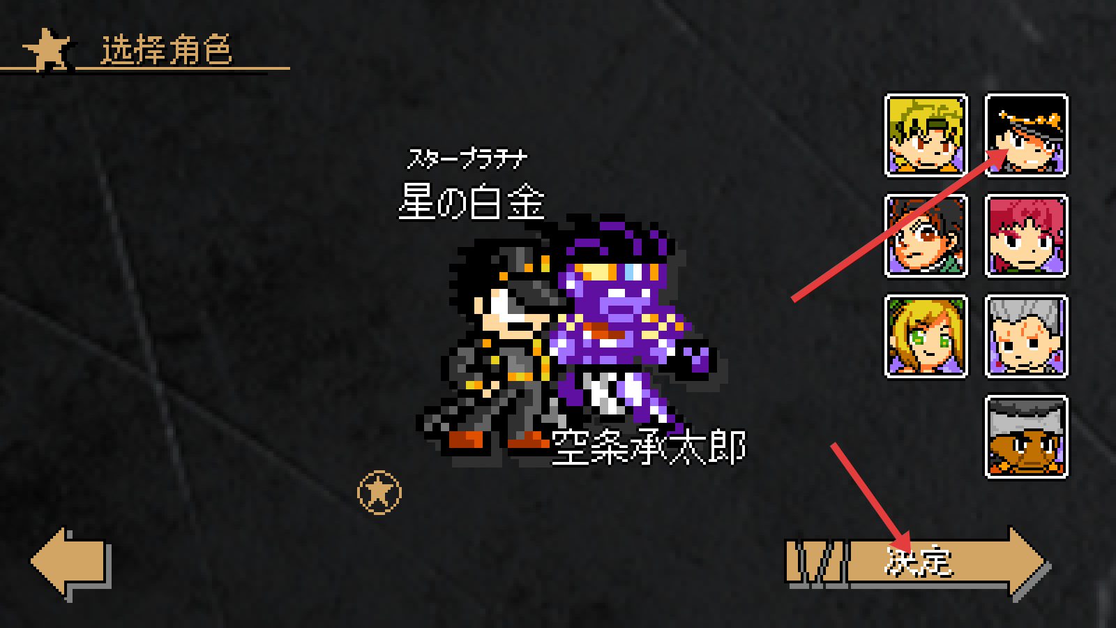 2、角色选择页选中【空条承太郎】等角色,确认阵容后点击【決定】,开启战斗征程。