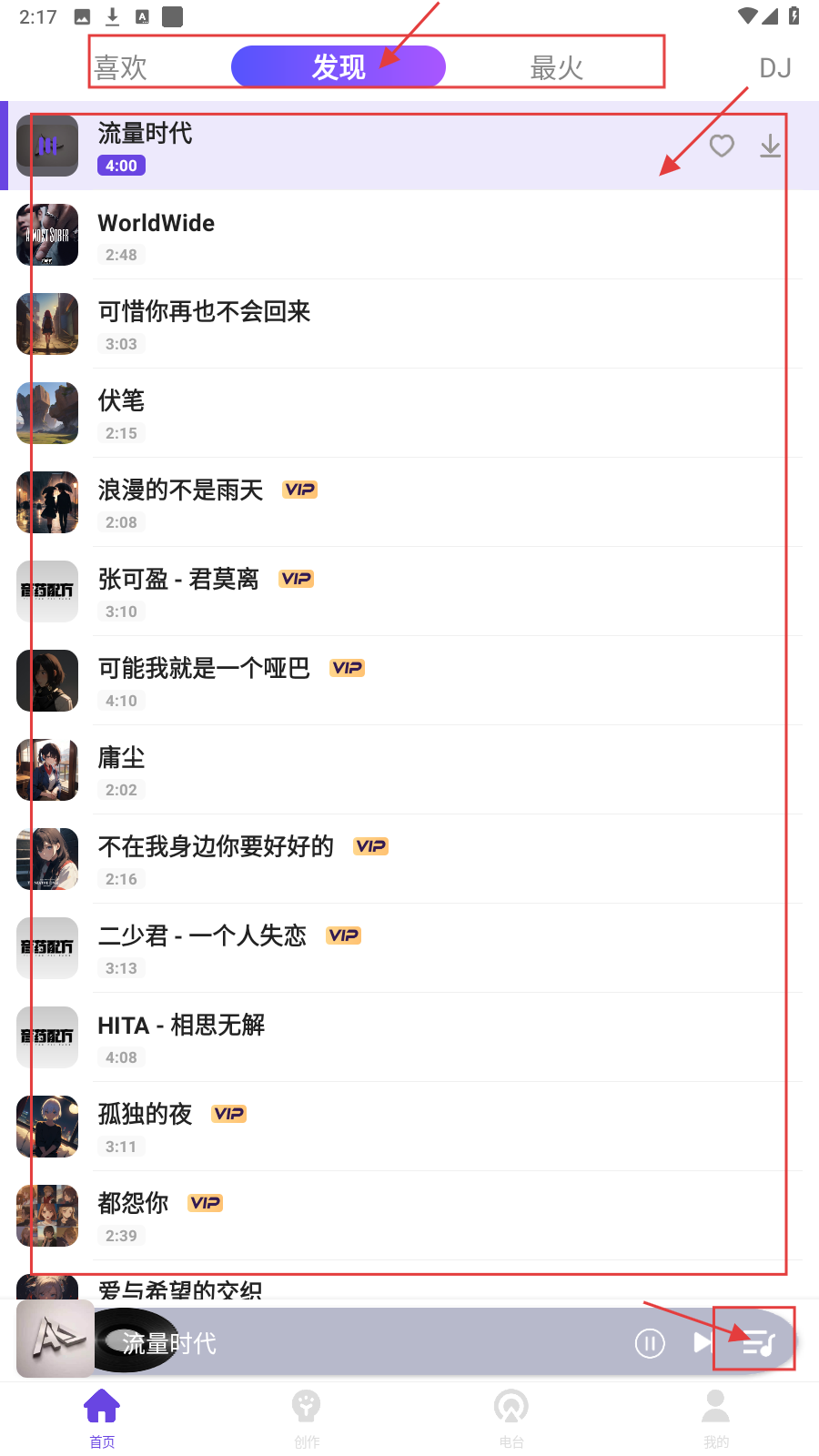 1、在【发现】页选喜欢的歌,点播放栏侧按钮管理播放列表。