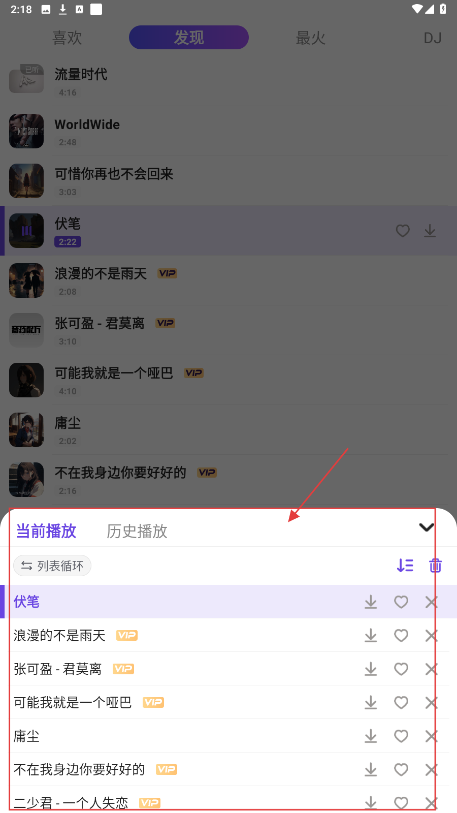 2、进入播放列表,可切换【当前播放】【历史播放】,管理歌曲。