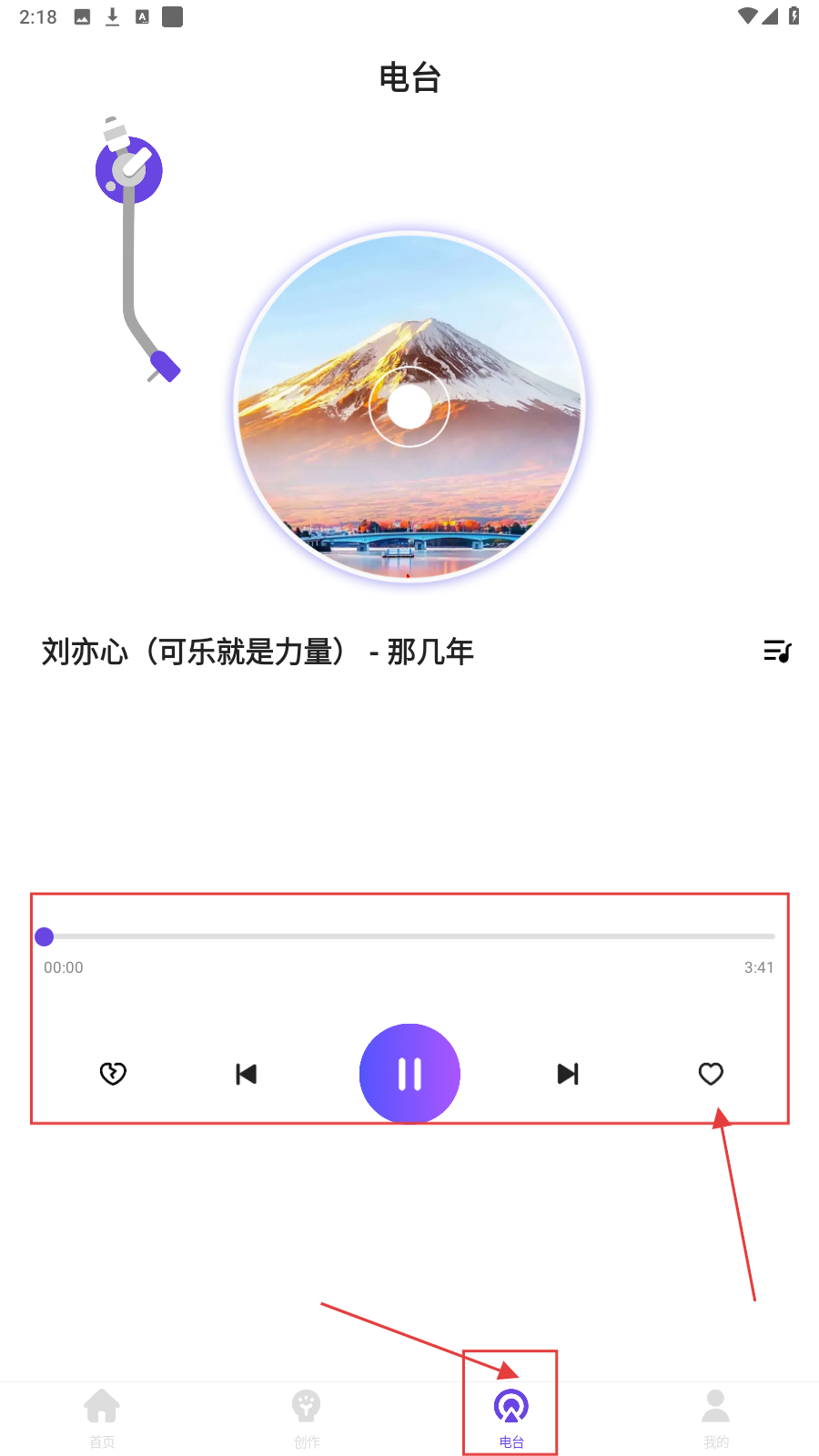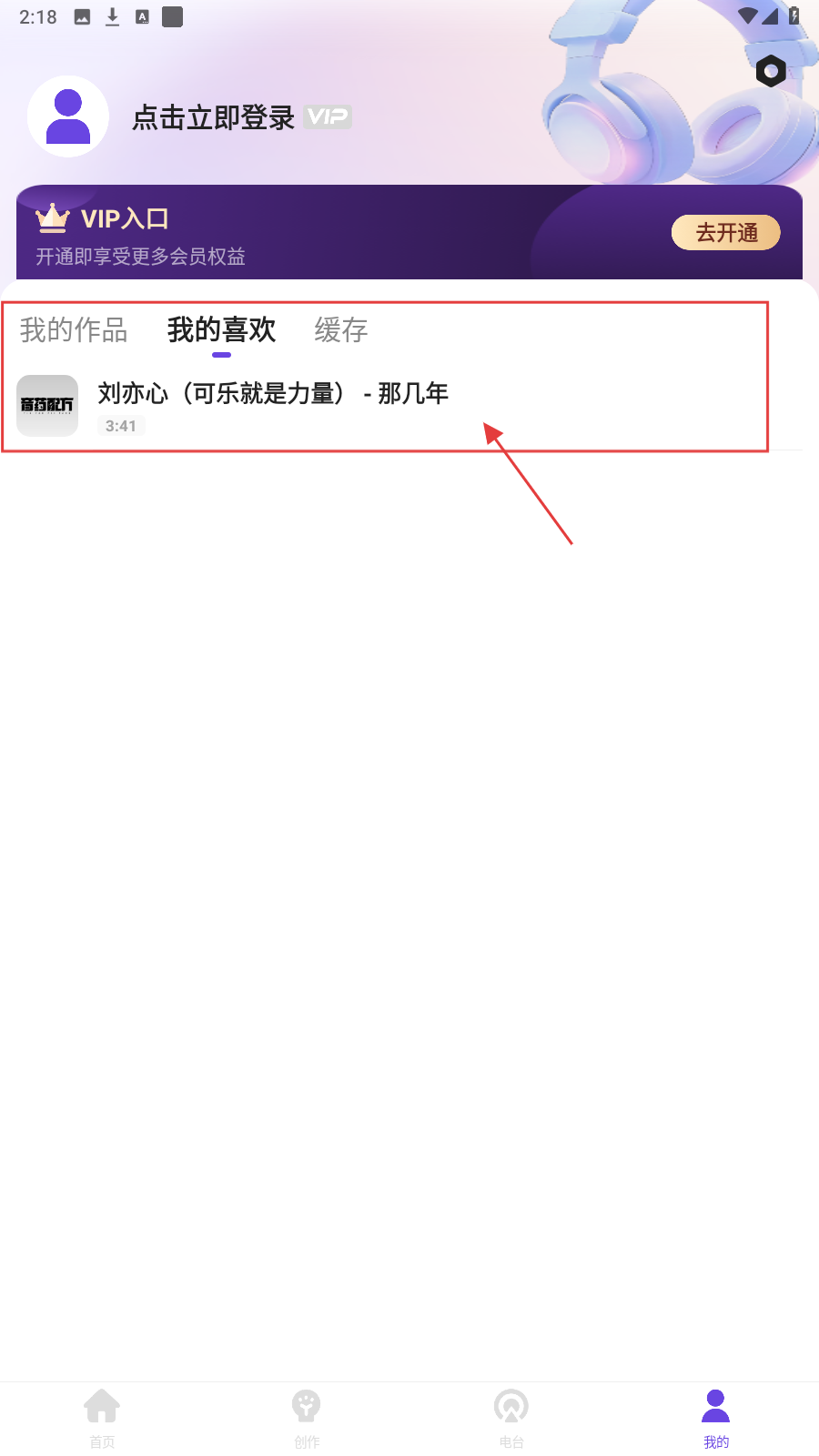 3、点【电台】听音乐,遇喜欢的点爱心,加入【我的喜欢】。