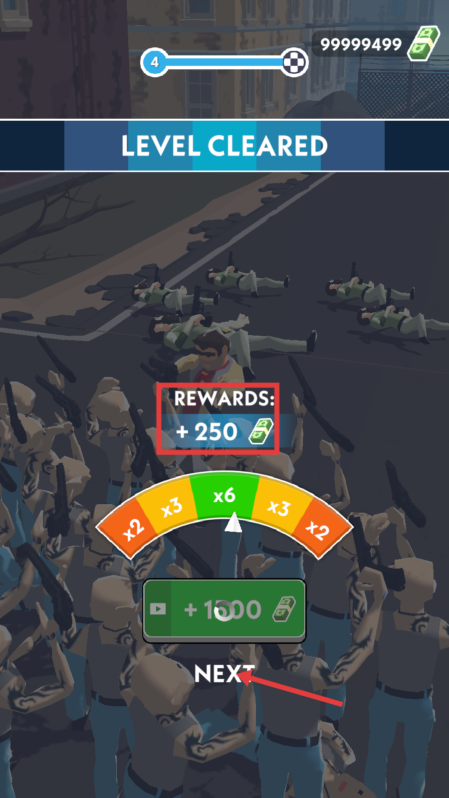 4、通关后领取【+250-货币】,点击【NEXT】,延续进程,挑战后续关卡。