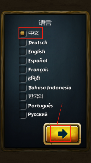 1、选择语言:在游戏设置中,点击选择你熟悉的语言,如中文,然后点击右下角的箭头确认。