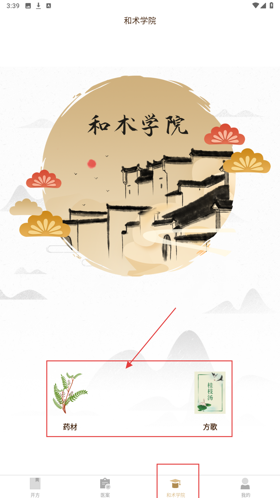1、进入【和术学院】页面,可选择【药材】或【方歌】模块开启学习。