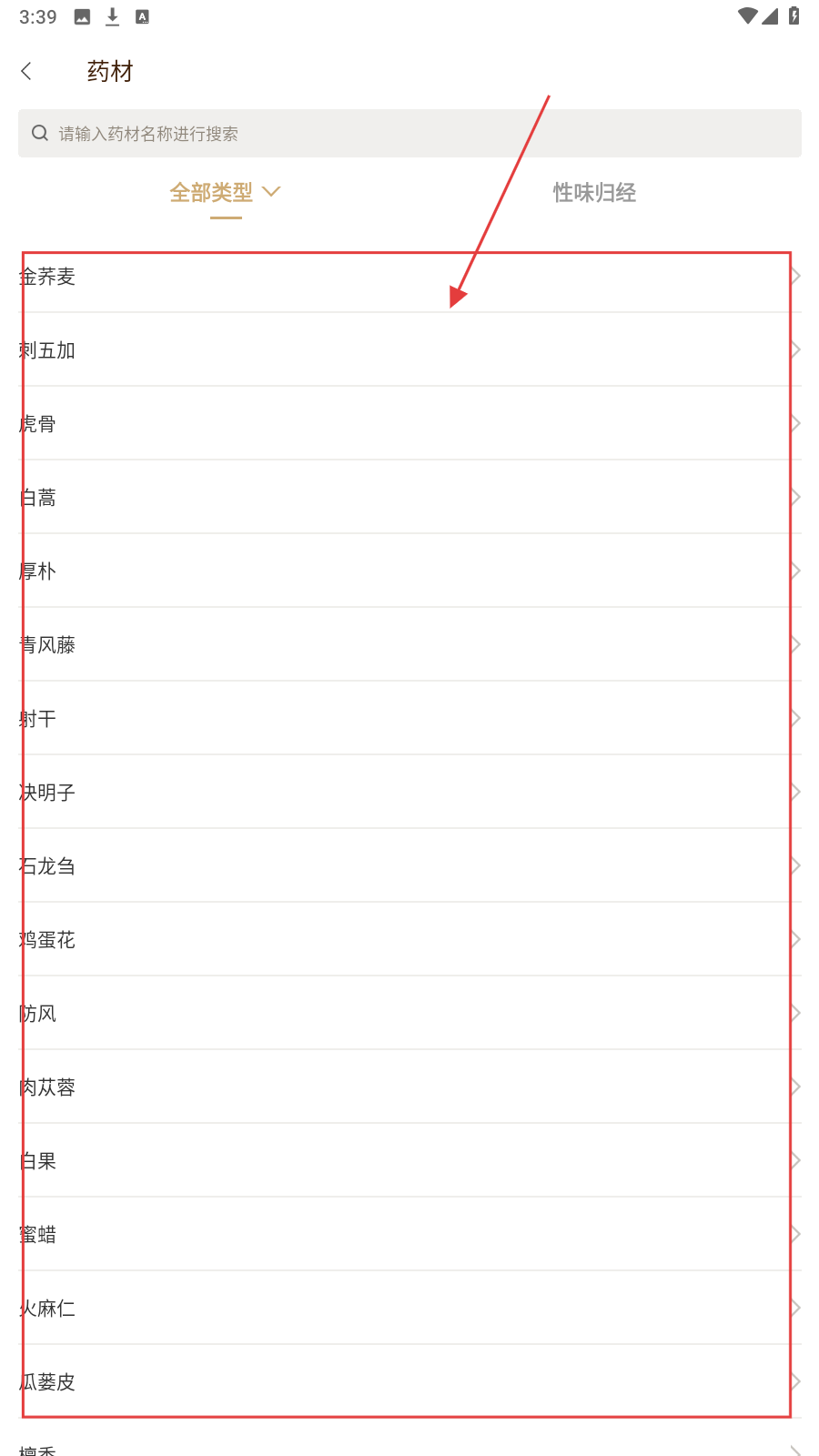 2、在【药材】页面,浏览金荞麦、刺五加等药材列表找目标药材。