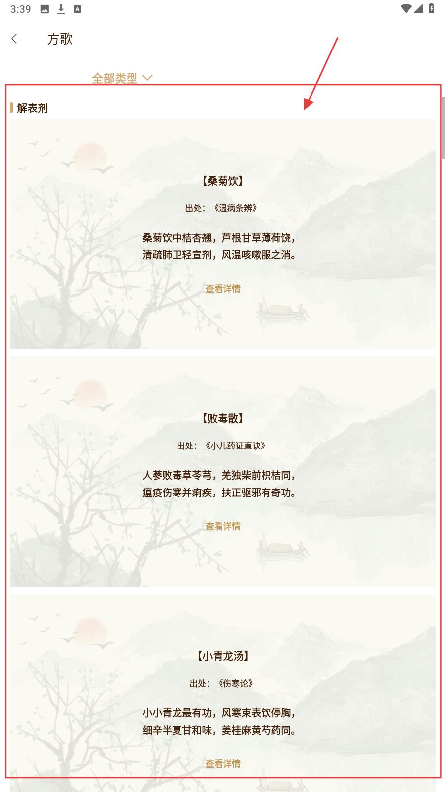 4、切换到【方歌】页,学习解表剂下桑菊饮、败毒散等方剂歌诀。