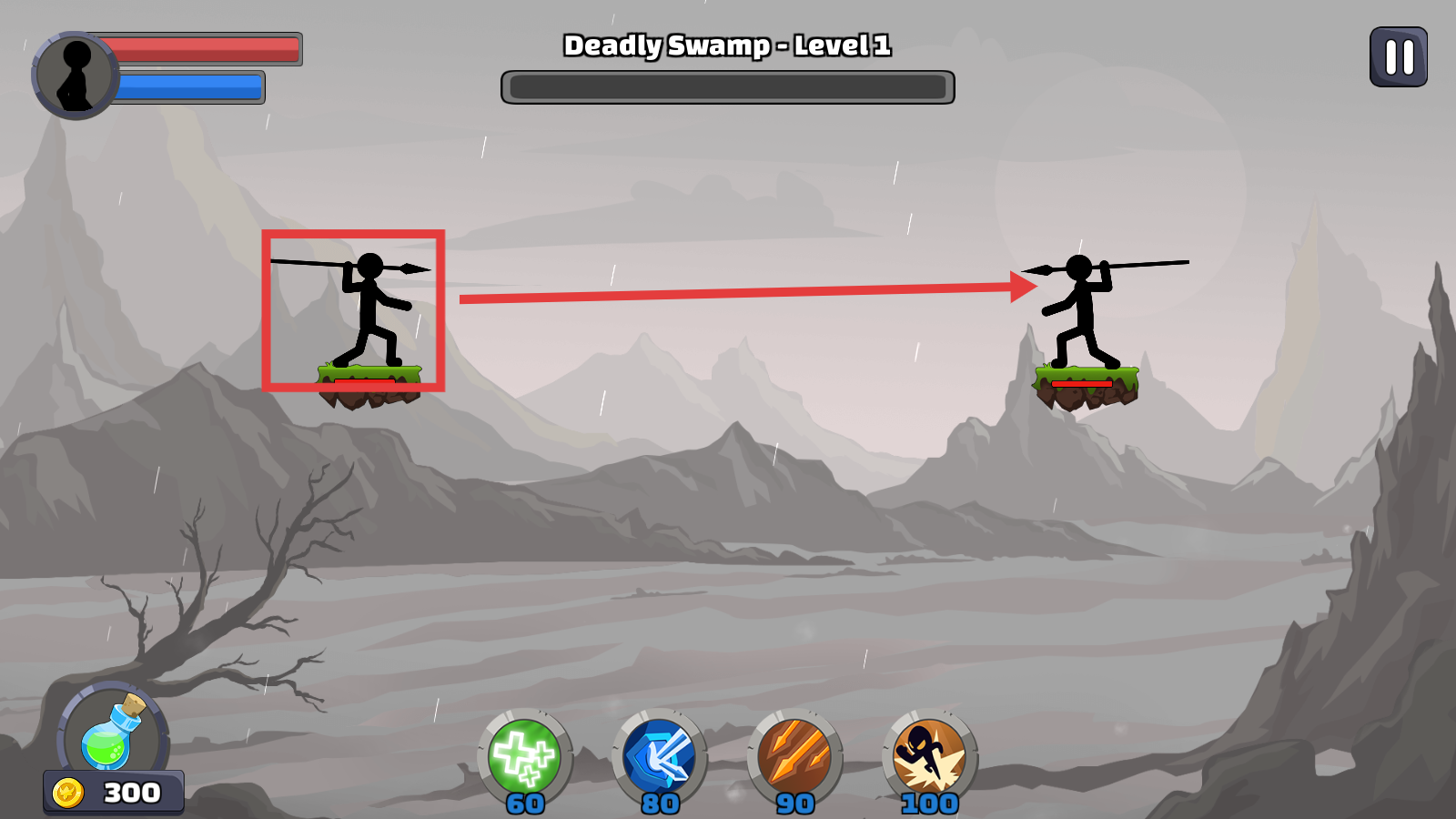 2、战斗中操控左侧持矛角色,瞄准右侧敌人,通过滑动屏幕向敌人掷出长矛,优先完成杀敌。